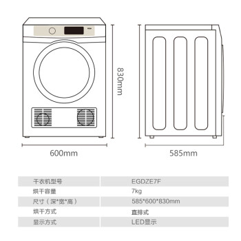 海尔 EGDZE7F 烘干机,排气式烘干,全时正反转,减少衣物缠绕,智能感知衣物湿度,衣干即停, 定时烘干,多种模式,LED数字显示,一目了然,带有线屑过滤器,规格:7公斤,产品尺寸585*600*830mm。