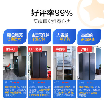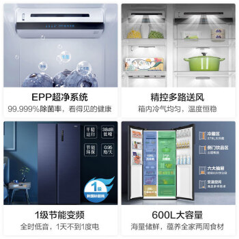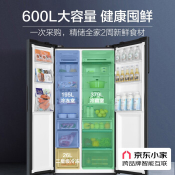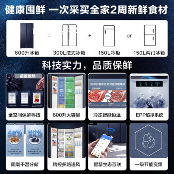 海尔 BCD-600WGHSS19B8U1 对开门冰箱,总容积高达600升,其中冷冻室195L,冷藏室379L,二星级冷冻26L。采用压缩机+离心风机双变频配置,冷冻能力高达17kg/24h,同时兼具省电和静音效果,制冷剂为R600a,耗电量0.95kw·h/24h,符合一级能效标准。含门尺寸为697*908*1775mm,高效利用空间,开门可以90°悬停,不用为冰箱两侧多留空间。8层精工叠印面板,拥有细腻触感,尽显高档品质感。