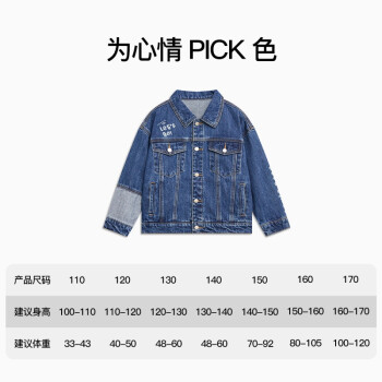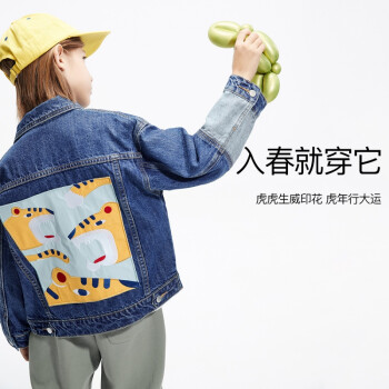 MQD 马骑顿 922130803 男童牛仔外套 中牛仔蓝,袖口正反拼接设计,时尚潮流。虎虎生威印花,萌趣可爱,寓意美好祝愿。