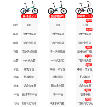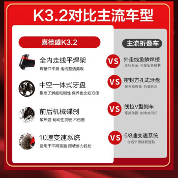 喜德盛K3.2折叠自行车,是K3折叠车后续升级版,沿用K3的多边形不等径铝合金抽管车架,强度高,重量轻,内走线由K3车架的双侧开孔改为单左侧开孔。把立管由K3的一体锻造不可调节把立,改为焊接式可调把立。速别由K3的8速升级为10速。一体锻造前叉同K3。浩盟中空轴一体48齿牙盘,发力顺畅。前后公路平装线拉单边碟刹。全新配色,整车配置极高,喜德盛折叠自行车中的代表作品。