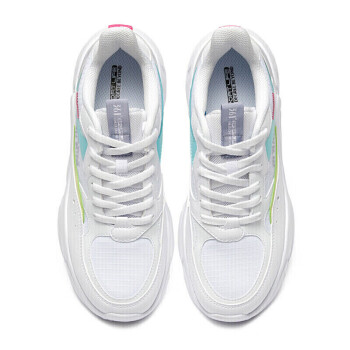 此款休闲老爹鞋鞋身是大面网布+革料拼接,侧前方冲孔+3M垫片,侧墙有字符元素印刷,上方软TPU装饰鞋身,半透明质感设计,此款有羽毛白/丹宁蓝,361度白/粉紫灰,奶油色/曜石黑三种配色。