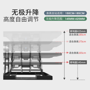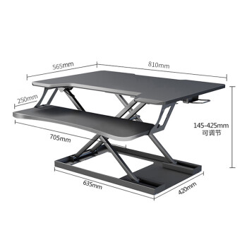 双层超大面板空间,80cm面板宽度。可放置2台显示器,1套键鼠组合,以及多种数码产品,15kg超高承重,高度可单手调节,办公必备好物。采用单边升降阀控制,可根据身高自行调节,在145-425mm范围调节。轻盈省力,女生也可轻松操作。