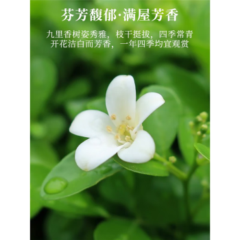 九里香花如其名,花开之时,香气迷人馥郁,仿佛九里之外也能闻到,素有千里香,过山香等称号。理想家居绿植盆栽,清新空气,花期悠长,开花飘香,驱赶蚊虫。