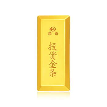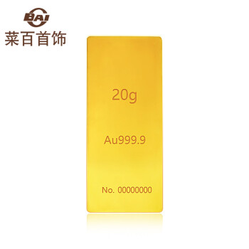 菜百首饰是北京菜市口百货股份有限公司的品牌,主营足金、千足金饰品、摆件、金条、铂金、钻石、翡翠、白玉、珠宝、金银币章、K-gold及18K金、银饰品等大类商品,拥有中国金币特许零售商资格,是北京规模最大、品种最全的黄金珠宝首饰专营公司。这款金条为梯形,长4cm,宽1.5cm,厚2.5mm。克重:20g。