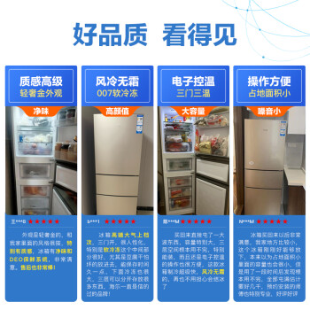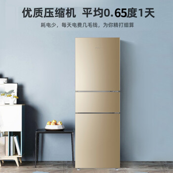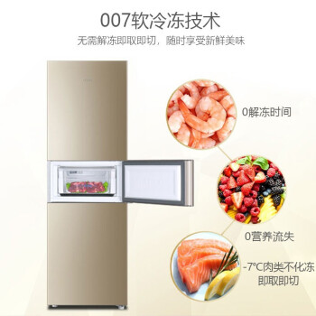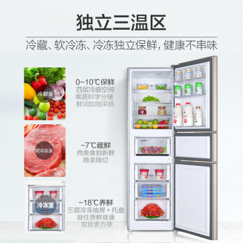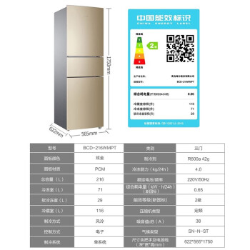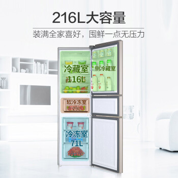 Haier海尔BCD-216WMPT三门冰箱采用风冷无霜设计,避免手动除霜,三门三温区,总容积216L,冷冻室71L,软冷冻室29L,冷藏室116L,定频压缩机,日耗电量0.65度,二级能效。