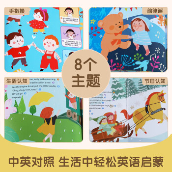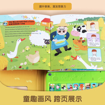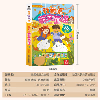 这是一本英文童谣发声书,由小书和发声玩具组成。精选了20首传唱度极高的英文童谣,专为学前儿童设计。20首英文童谣均由真人录唱,美式英语纯正发音,培养宝宝的英文语感。在唱英文童谣的过程中,宝宝可以根据图画和文字学跳韵律操,培养宝宝对英语的兴趣,节奏感和肢体协调能力。小手按一按发声玩具,童谣随时听。