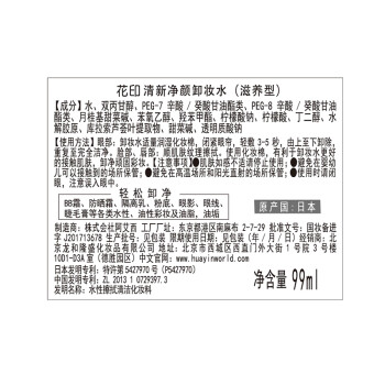 这款花印清新净颜卸妆水,为水状质地,温和无刺激,不油腻。对于卸掉BB霜,粉底,眼影等效果不错。用完后皮肤比价净白而且不紧绷,滋润清爽。适合不喜欢卸妆油的妹子们。