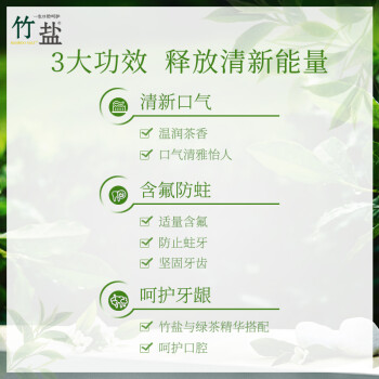 竹盐是将装入青竹中的日晒盐用黄土封口,再以松树为燃料,经多次煅烧后提炼出的物质。具有抗菌、消炎、保护牙龈的作用。不同于其他竹盐牙膏的是,此款由于添加了植物萃取,而为淡淡的茶香味,对于不适应竹盐味道的网友来说更容易接受。