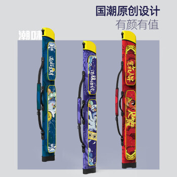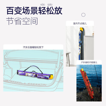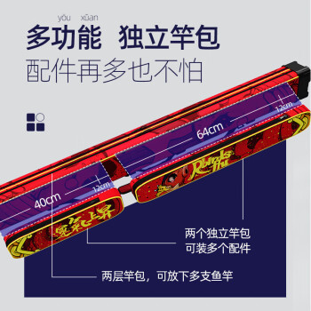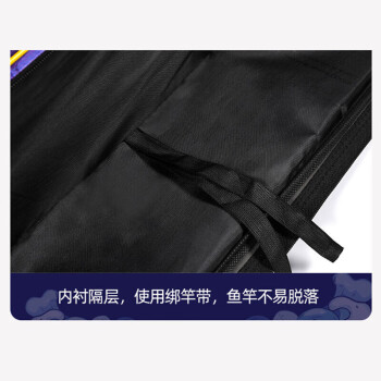 600D牛津布,高密度,防污,防泼水性好,防滑耐磨。多功能,两个独立竿包,可装多个配件。两层竿包,可放下多支鱼竿。