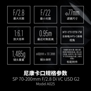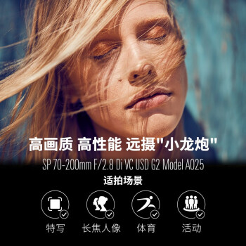 腾龙 SP 70-200mm f/2.8 Di VC USD G2(A025)镜身黑色涂装,193.8mm长、1500g重,支持防尘防滴,镜身上拥有AF/MF切换开关、0.95m-∞/3m-∞对焦切换、VC防抖开关与三种VC防抖模式切换。三种VC防抖模式分别为基本模式、平移拍摄专用模式与补偿效果优先模式,且最高可补偿5档快门补偿,用户可以根据拍摄状态来切换防抖模式。A025搭载USD环形超声波马达,并配备2枚处理芯片,官方表示相对于A009,A025在对焦速度和精度均有显著提升。A025采用17组23片光学结构,其中包括若干XLD超级低色散镜片和LD低色散镜片,并且拥有eBAND镀膜、防污涂层等配置。对焦距离由之前的1.28m缩短至0.95m,而0.95m的最近对焦距离也是70-200m f/2.8镜头中最短的。此外,A025拥有9片光圈叶片,光圈范围为f/2.8~22,滤镜尺寸为77mm,支持1.4倍、2.0倍增腾龙倍镜。A025将会提供佳能、尼康两个版本(尼康版本采用电磁光圈)。