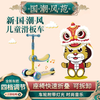该滑板车带有国潮贴花,传统与现代文化的结合,新颖有趣。座椅可一键折叠,四档高度可调节。承重高达100kg,后轮脚刹,一踩即停。车身黄金三角形构造,不易侧翻。多种款式可供选择。