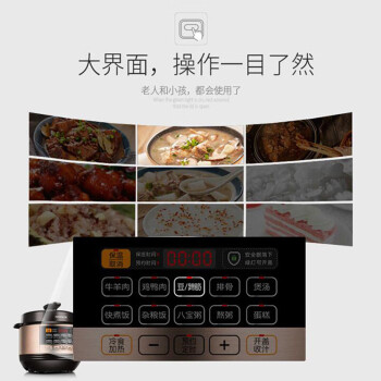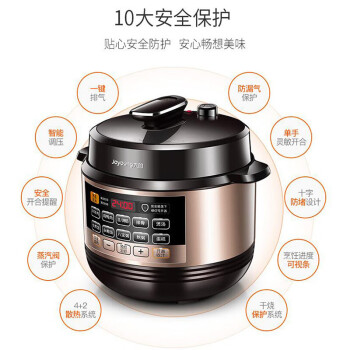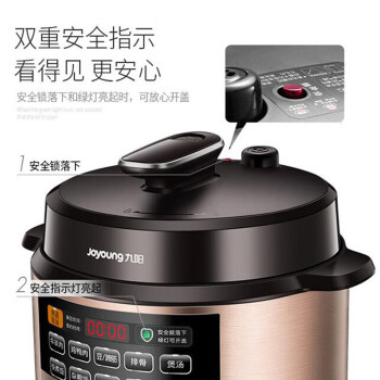 九阳(Joyoung)这款型号为Y-50C81的电压力锅,5L容量,球形双内胆,铜匠厚釜+晶瓷球胆,一锅双胆不串味,智能压力调节,根据食材定制压力曲线,营养与美味并存,一键开盖收汁,开盖收汁,食材更入味,香浓入骨。