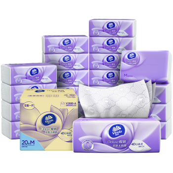 Vinda 维达抽纸立体美系列:精选进口100%原生木浆;采用4D-Deco压花工艺,层级之间形成众多凹凸间隙,纸质比维达其他产品更加蓬松,更加亲肤,体感更好;表明分布着网状的棉韧线条,形成导流作用,吸水性也有所提高;维达抽纸立体美系列产品抽样通过第三方机构,测试结果皮肤刺激性为0,这样使用户更安心更安全,洗脸后擦拭也不会留纸屑,触感柔和顺滑,价格也十分合算。还需要提醒的一点由于抽纸比厕纸韧性更强,抽纸使用后不适合扔到厕所里哦。