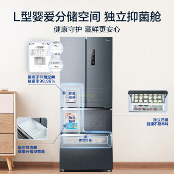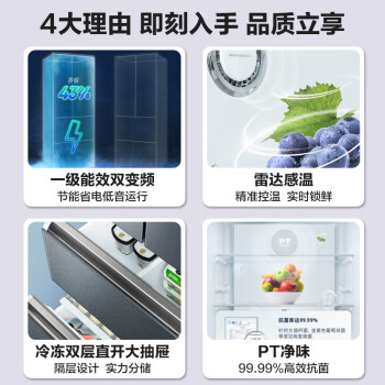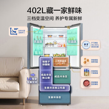 内置变温抽屉,三档“场景式”触摸变温随心调节, 食材新鲜一键即达,满足你不同的存鲜需求。风道内置铂金净味装置,有效吸附并分解异味因子, 冰箱清新无异味,宝宝辅食更健康。