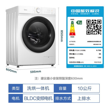 Midea 美的 MD100V11D 10公斤 洗烘一体机 ,19年8月上市,10公斤大容量,主打纤薄设计,有效节省厨卫空间。1400转BLDC电机,拥有多种洗涤程序,巴氏除菌,祛味空气洗减少水洗次数,呵护衣物纤维和色泽。烘干容量7KG,羽绒服低温烘干,自编程洗涤,95℃筒自洁,洗净比1.05,产品尺寸595*600*850mm。