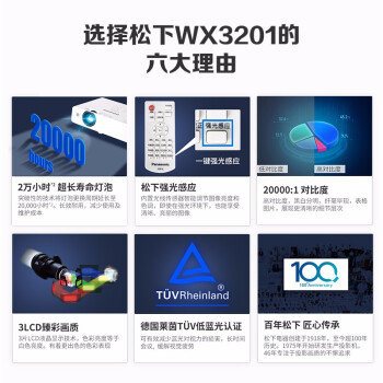 Panasonic 松下 PT-WX3201 投影仪,采用松下UHM超高压汞灯泡,亮度高,发热量小,寿命长,高亮度不惧日光,开启强光感应功能,动态光圈计数加强对比度,20000:1高对比度使黑灰白层次更明显彰显精细画面,3片液晶投影系统投射全彩图像,色彩层次丰富,1024*768高清分辨率画质更细腻.
