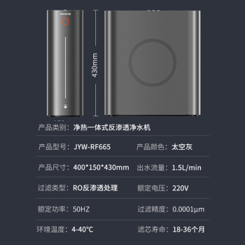 九阳这款净热一体机JYW-RF665,600G通量,采用航天抑菌V膜,能够实现1.5L/min出水速度,具有四重抑菌技术,纯废水比2:1;支持多档水温调节,45℃-89℃每1℃可调;搭载底盘速热技术,快速加热沸腾,自然降温保温,用尽后自动补水,杜绝千滚水;配备智能数显水龙头,温度调节、滤芯使用状况一目了然;具有150mm纤薄机身,节省厨下空间。