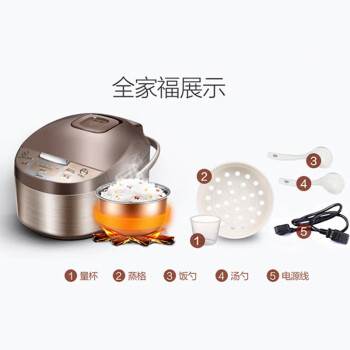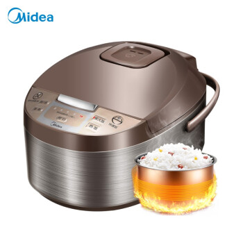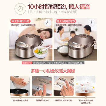 美的MB-WFD4016电饭煲,容量4L,内胆锅采用不粘涂层黄晶内胆,带有超快煮、柴火饭、热饭、蒸煮、粥汤等多种模式,最长可预约10小时。外观采用金属拉丝设计,蒸汽阀可拆洗。附赠蒸格、量米杯、饭勺及汤勺。