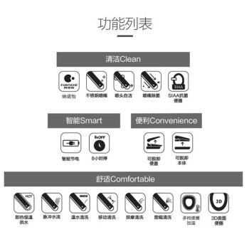 本款马桶盖采用纳诺怡技术制作,可有效抵御90%细菌,给您更加洁净的如厕体验。内部使用日本进口陶瓷加热芯,即热式出水,干净卫生。支持3档水温和水流强度调节,搭配4大清洗模式,满足您的个性化需求。3D曲面便圈结构,充分贴合人体曲线久坐更舒适。