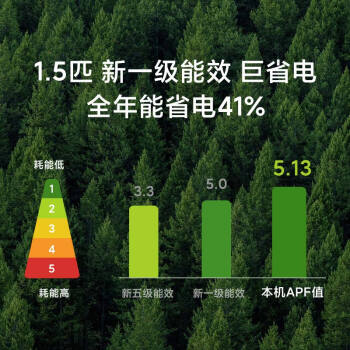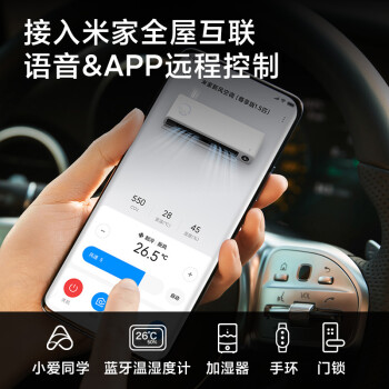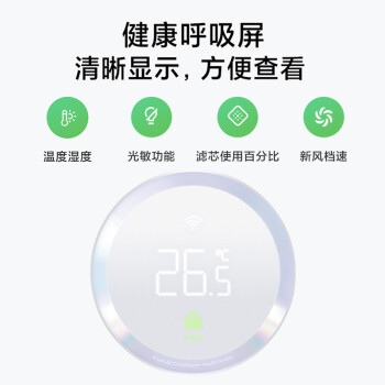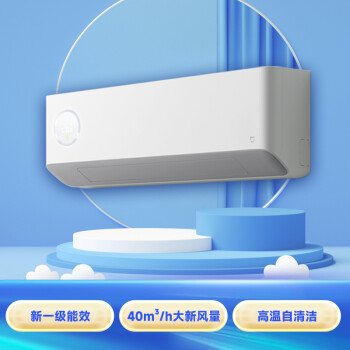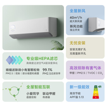 米家新风空调包括1匹和1.5匹两种规格,采用R32冷媒,APF值为5.13,符合新一级能效标准,该产品集空调+新风机+净化三种功能于一身,作为新风机,产品采用了自家研制的离心增压涡轮技术,风量可达40m3/h,既可以独立使用,也可以与制冷/制热/风扇模式同时使用。作为净化器,定制的HEPA滤芯可以有效抗菌抗病毒。产品还配备健康屏,增加了一个显示屏,可以实时显示二氧化碳浓度,并且可以与米家温湿度计进行联动。