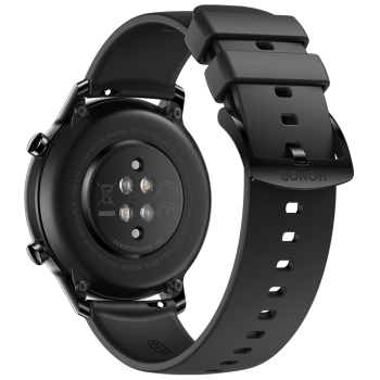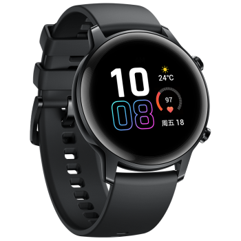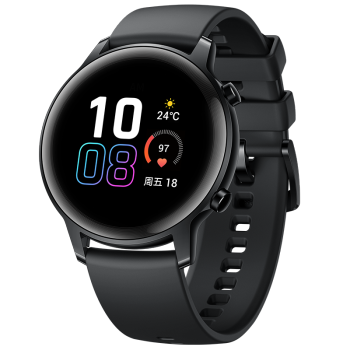 Honor MagicWatch 2 42mm款拥有运动款玛瑙黑和雅致款樱粉金,1.2英寸AMOLOED材质圆屏,充电接口为磁吸顶针充电口,典型工作时间7天、GPS运动场景可达15小时。