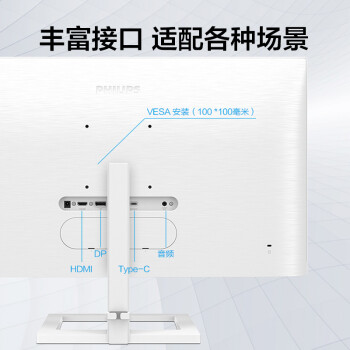搭配的Type-C接口,一线提供数据、视频、音频传输,反向充电。节省桌面空间。支持一键调节,智能自定义。搭载PIP/PBP智能分屏技术,实现同步多任务工作。飞利浦推出画面调节技术,当观看暗色调或玩暗色调游戏时,它会分析所显示的内容,自动调节色彩并控制肖光亮度。配备有VESA安装(100*100毫米)壁挂接口、HDMI、VGA、音频、理线槽。采用护脊升降底座。