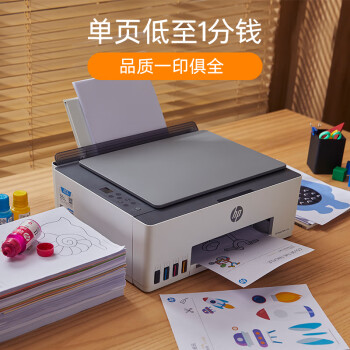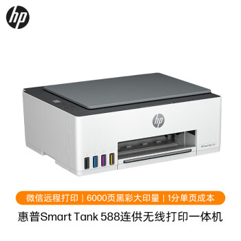 惠普 京印588 彩色打印一体机,内置6000页黑彩同量大墨盒,黑白打印单张低至0.01元,彩色打印单张低至0.23元,三合一多功能,家用打印需求,统统满足,内置自我修复WiFi,支持微信打印/HPSmart APP等花式连接,便捷易用,搭配HP Smart APP,可用多种便捷打印功能,丰富娱乐素材,常见打印所需,统统搞定。可支持A4、B5、A6、DL信封等尺寸。