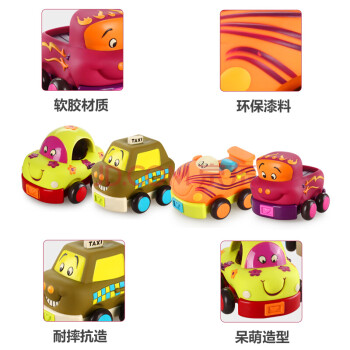 B.Toys是美国知名玩具品牌,拥有超过40年的生产最高品质的玩具经验,这款宝宝回力车4个装, 不含BPA,无铅无塑化剂,不同车型还带有各自的声音,可以增强儿童动手能力,发展视听智力。