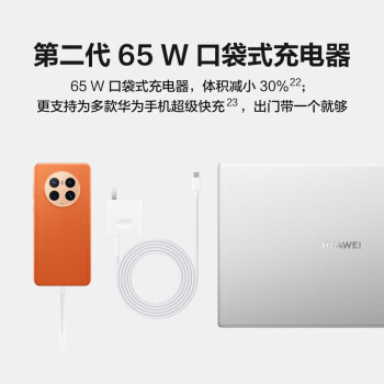 此外,支持华为分享功能,手机可分身至电脑,画面更直观,跨系统互动,最多支持3个应用窗口同时打开,可浏览手机文件、接打电话。标配65W小巧充电器,支持指纹解锁。接口方面含USB2.0*1、USB3.2 Gen1*1、HDMI 1.4接口*1、多功能USB-C接口以及3.5mm耳机孔。