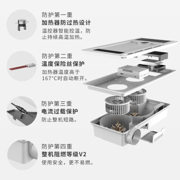 多重防火阻燃保障,防护第一重,加热器防过热设计,温控器智能控温,防止持续高温加热。防护第二重,温度保险丝保护,加热器温度高于167°C时自动断开。防护第三重,电流过载保护,防止整机短路。