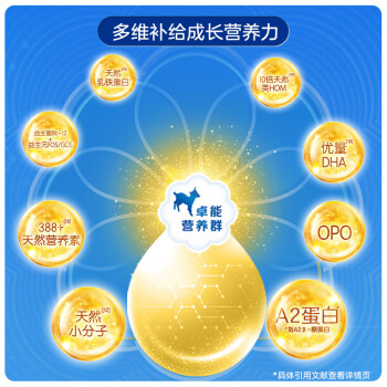 Kabrita品牌创建于1897年,是一个拥有百年历史的老字号品牌,旗下主要的产品有新鲜羊奶、羊酸奶、羊乳酪、婴幼儿配方羊奶粉、妈妈羊奶粉,是较早推出婴幼儿羊奶粉的品牌。这款悦白系列奶粉采用纯羊乳蛋白配方,未添加牛乳蛋白,羊奶脂肪球颗粒更细小,相比牛奶,羊奶更容易消化吸收。富含OPO结构脂和益生菌益生元组合,调节肠道功能,降低上火便秘几率。添加DHA+ARA帮助宝宝大脑和视力更好的发育,采用先进的脱膻技术,保证奶源纯正口感,不添加蔗糖、麦芽糊精等,不会造成宝宝龋齿等口腔问题。