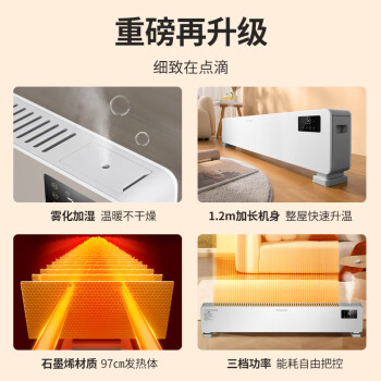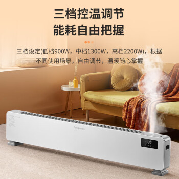 这款Panasonic 松下 DS-AK2232CW 石墨烯踢脚线取暖器,采用数码大屏幕显示设计,数据内容直观易懂, 老年人也能看得清楚,不必担心使用困难;低音运行无打扰,不影响夜晚睡眠;配备遥控操控设计,操作使用更方便,不受距离影响;配有24小时定时功能,晚上睡前预约好,第二天到点直接关闭,不会出现匆匆忙忙上班而忘记关闭的安全隐患;配有安全童锁,防止儿童不小心误触,设计更贴心;内置升级款石墨烯发热体,具有导热性更高、升温更快等优点,搭配2200W速热功率,做到开机即热,温暖全屋不等待;三档温度可调节,适用于多种取暖环境,实用性更强;为了防止使用过久全屋干燥,松下DS-AK2232CW 石墨烯踢脚线取暖器还配有加湿装置,带来舒适的使用体验;IPX4级防水设计,内部电线绝缘防触,多个场景都适用,即便在浴室使用也没问题,安全不担心;此外,还有倾倒断电设计、过热保护设计、支撑脚架设计,后续使用更安全更放心。