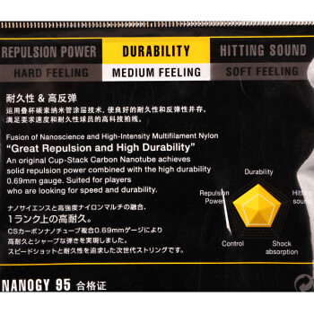 纳米涂层为95线的带来了柔和的击球感,上手打感较为舒适,其线径使用的是0.69毫米的复合尼龙丝,整体上的表现就像是BG65的综合升级版。耐打与65接近,但弹性、球感都有所提高,是非常均衡全面的一条球线。