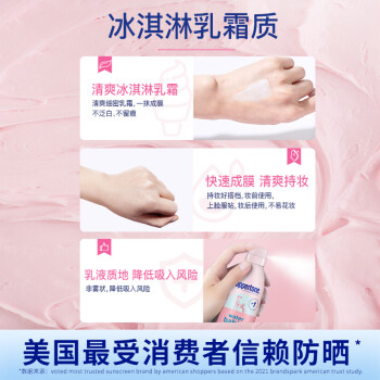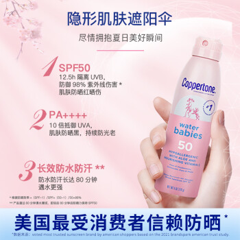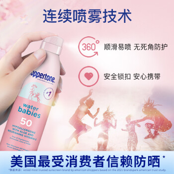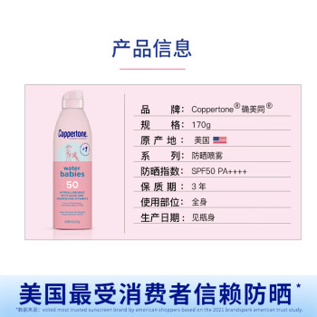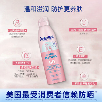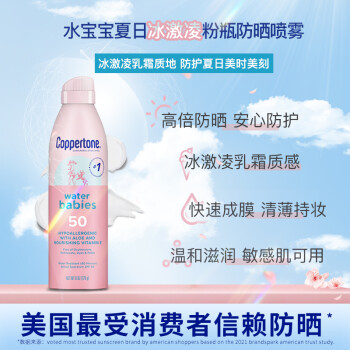 这款Coppertone 确美同水宝宝防晒喷雾有着高倍防晒安心防护冰激凌乳霜质感,快速成膜清薄持妆温和滋润敏感肌可用5h隔离UVB,防御98%紫外线伤害*,肌肤防晒红晒伤10倍抵御UVA,肌肤防晒黑,持续防光老防水防汗长达80分钟遇水更强,清爽冰淇淋乳霜清爽细密乳霜,一抹成膜不泛白、不留痕青爽持妆用,不易花妆防水防汗长达80分钟遇水更强乳液质地降低吸入风险非雾状,降低吸入风险。