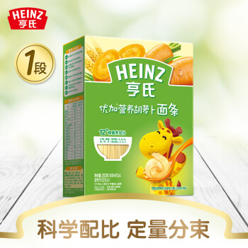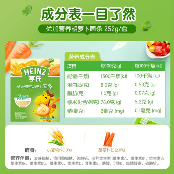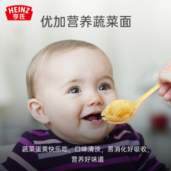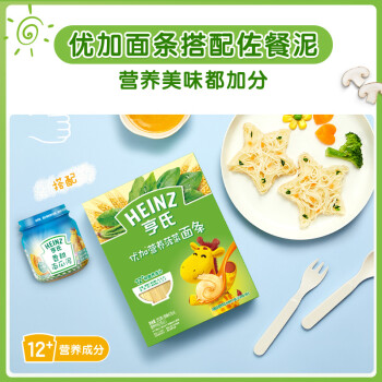 130多年历史的美国Heinz亨氏集团是全球最大的婴儿米粉和婴儿瓶装产品生产商之一。这款优加系列 儿童营养面条,含维生素C、维生素AB族等多种营养,添加多种营养,专为宝宝设计。中筋度面粉,细小易消化,宝宝肾脏功能尚未发育健全,建议不添加食盐。