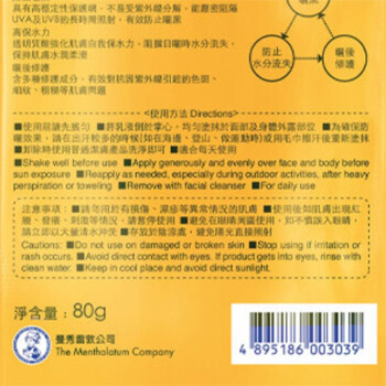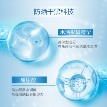 Mentholatum曼秀雷敦是知名度超高的平价护肤品牌,来自日本。这款新碧双重保湿水感防晒露,采用了solarex-3三重护肤级防晒技术,防晒指数高、波段全,不会厚重、拔干,大量涂抹时脸部的泛白度也很轻微。它颜色微黄,有着水润感的乳液质地,颜色微黄,添加了纳米透明质酸、水活银耳精华、维C,上脸能感受到保湿力,防止日晒造成的水分流失,肤感是有滋润度的微粘微湿感,非常适合混干皮、中性皮、干性皮使用,80g容量也适合拿来做身体防晒。需要提醒的是,如果对酒精成分过敏的小伙伴可能不适合这款防晒。