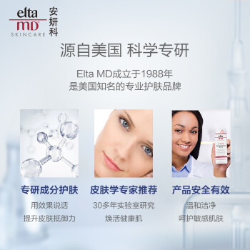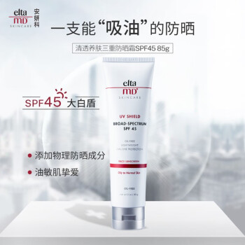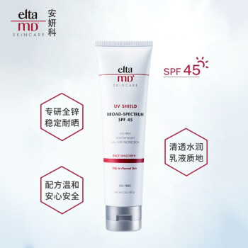 ELTA MD是Swiss-American公司下的一个护肤品牌。它建立在负责和创新应用的医学专业知识和科学的思维方式基础上,产品专注于提供安全、有效的皮肤管理,适用于所有肤质,特别是敏感肌肤,主打无香精、无色素、温和、无油等。 Elta MD这款清爽无油防晒霜的防晒指数高达SPF45,是一支高倍防晒,它含有9%的透明微粒氧化锌(物理防晒成分)和7.5%的桂皮酸盐(化学防晒成分),因此是一支物理化学相结合的防晒,能够真正抵抗UVA和UVB,有效减少紫外线对皮肤造成的伤害。另外,这这款防晒霜延展性强,不油腻,对肌肤无负担,油痘皮也可适用。