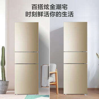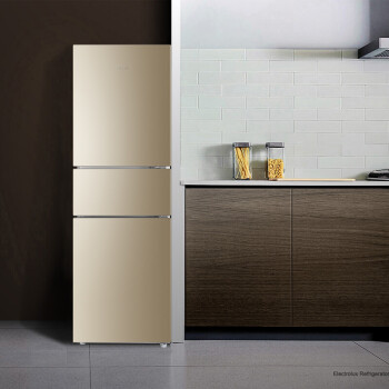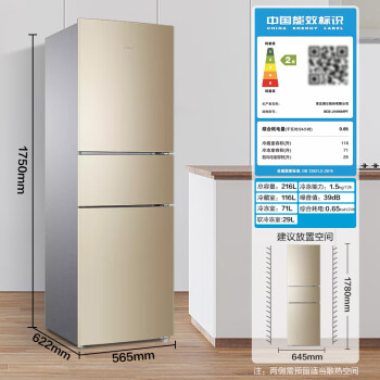 Haier海尔BCD-216WMPT三门冰箱采用风冷无霜设计,避免手动除霜,三门三温区,总容积216L,冷冻室71L,软冷冻室29L,冷藏室116L,定频压缩机,日耗电量0.65度,二级能效。