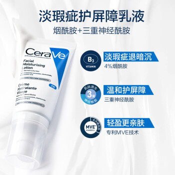 CeraVe是美国知名护肤品牌,属于医药级系列护肤产品,其采用的是MVE科技,模拟皮脂膜生产线。这款CeraVe Moisturizing Facial Lotion PM 夜间美白保湿修复乳液,主打修复,富含细胞沟通因子,添加了VB3,耐受的童鞋可以用来晚间修复。产品内添加了神经酰胺、烟酰胺、及透明酸质等成分都是不错的促进肌肤保湿水润的元素,适合干性肌肤及中性肌肤使用,不适合痘痘肌。规格:89ml。