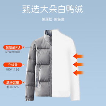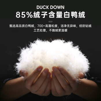 85%白鸭绒,精选内料保暖御寒。加厚短款,高效锁温温暖包裹。700+高蓬松度,洁净无异味,经防钻绒工艺处理,不跑绒更温暖。