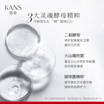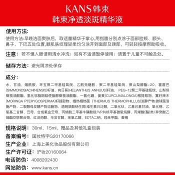 韩束是目前国产知名护肤品牌之一,2002年创立于上海,2004年第一家生产工厂落成,巨补水系列、红石榴系列,都是韩束旗下知名度较高的护肤系列。这款净透淡斑精华液来自热门的银胶囊系列,主打双效复配美白体系,2.5%乙酰壳糖胺帮助减少黑色素生成,缓解肤色暗沉问题,3%烟酰胺阻止黑色素传递表达,并加速沉积色斑的代谢,改善肌肤可见的色素暗沉与肤色不均;二裂酵母发酵产物溶胞物中富含的多种微量元素和抗氧化物质,帮助对抗氧化暗沉,提升肌肤光泽感,嗜热栖热菌提取物富含天然肌肤保护成分,阻隔环境刺激损伤,并提升水通道蛋白活性,提升肌肤各层水分交换速率,微球菌提取物帮助增强肌肤储水力,改善肌肤干燥暗沉