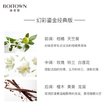 冰希黎(Boitown)推出的这款幻彩鎏金女士香水,采用如钻切割的粉色瓶身设计,搭配瓶颈上的金色脖饰点缀,整体精致优雅。香水是木质花香调,果香与花香交织,清新淡雅;加入温暖木香打底,醇厚柔和。 前调:青杏仁 苹果 黑醋栗 中调:小苍兰 牡丹 玫瑰 玉兰 香米 后调:麝香 黑香豆 檀香 香草
