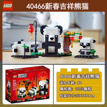 这款乐高 40466 新春吉祥熊猫 属于方头仔系列,2021年1月首发,包含249颗粒,适合10岁以上的朋友,最新的方头仔动物系列,都是选择了多个角色,一般一大一小出现,这款更为特别,选择了一大两小的形象,非常有新意。我们都知道熊猫是中国的国宝,所以可以看出这款乐高方头仔从选角到配色都非常的中国风,这款套装包含熊猫妈妈和她的两只幼崽,其中一只坐着,另一只躺着,每只熊猫都拥有自己的坚固底板,套装还配有竹子、灯笼和可拼搭的柑橘树,非常具备节日特色,喜庆祥和的象征。熊猫妈妈直立高度为8 厘米,两只幼崽直立高度为5 厘米。