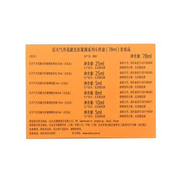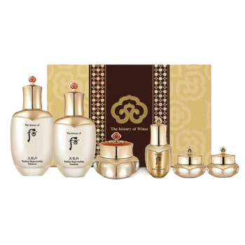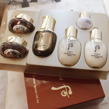WHOO后的高端华泫(花献)光彩紧颜系列,较适合25岁以上的任何年龄任何肤质女性,汇集韩国宫廷美颜秘方,主要成分有山参玉珠、鹿茸粉骨、黄金朱木等成分,补水保湿、抗氧抗皱,改善肌肤干燥。每件瓶口采用按压式设计,可控制用量。如敏感型肌肤,可先小范围使用。