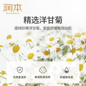 RUNBEN(润本)其商品主要以天然健康婴儿护肤产品为主。采用天然洋甘菊植物提取液,温和成分不刺激,无硅油,温和氨基酸成分,更适合宝宝幼嫩肌肤,给宝宝更温和的呵护,无泪配方,改善敏感肤质,滋润肌肤。规格:500ml/瓶。