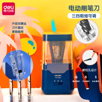 电动削笔刀采用合金钢刀芯,电池\USB双驱动,5秒削钝笔,10秒削新笔,切削省力;三档粗细可调节,轻松满足书写需求;拥有断铅孔设计,无需拆卸便可轻松排出;可削笔杆直径为6.9-8mm,旋钮向左滑动调细,向右滑动调粗;3种笔尖任你挑选,适用于书写、绘画、涂鸦等多种场景。