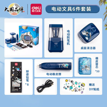 常用学习五件套,内含电动削笔机+桌面吸尘器+电动橡皮擦+橡皮擦替芯+闪光镭射铅笔,另外还赠送航天少年贴纸,一套多样功能齐全。