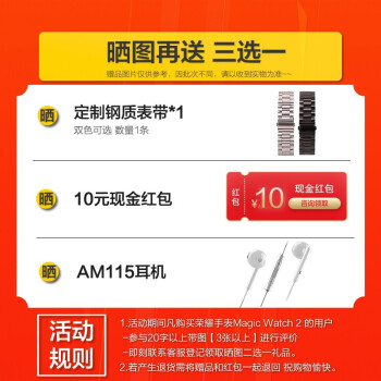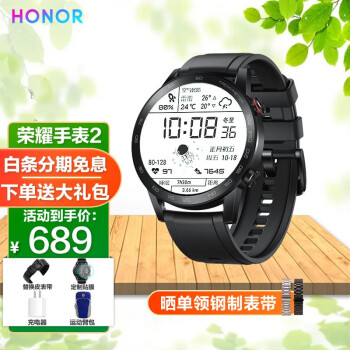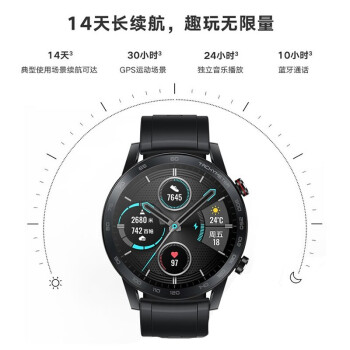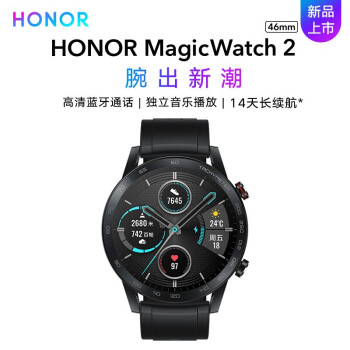 Honor MagicWatch 2 拥有运动款碳石黑和时尚版亚麻棕两种配色,拥有运动手表外观,46mm版表盘为1.39英寸AMOLOED材质圆屏,碳石黑表体材质为金属+塑胶,亚麻棕版本表带为牛皮,典型工作时间14天。功能方面,其支持24小时心率监测、血氧饱和度查询、睡眠呼吸暂停研究、心脏健康管理,GPS+北斗定位,扫码支付,NFC公交卡等,支持表盘一碰传功能,支持15种运动模式、13门专业跑步课程等。配置方面,其搭载麒麟A1芯片,多传感器,支持独立音乐播放。运行内存32MB,存储空间4GB,蓝牙版本5.1,支持50米防水,电池容量455mAh,三围45.9×45.9×10.7mm,重约41g。