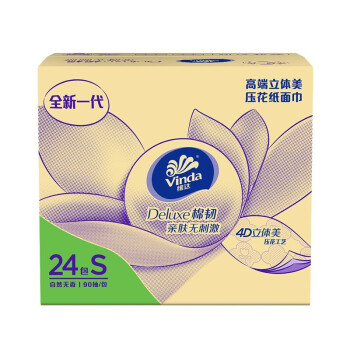 Vinda 维达抽纸立体美系列:精选进口100%原生木浆;采用4D-Deco压花工艺,层级之间形成众多凹凸间隙,纸质比维达其他产品更加蓬松,更加亲肤,体感更好;表明分布着网状的棉韧线条,形成导流作用,吸水性也有所提高;维达抽纸立体美系列产品抽样通过第三方机构,测试结果皮肤刺激性为0,这样使用户更安心更安全,洗脸后擦拭也不会留纸屑,触感柔和顺滑,价格也十分合算,还需要提醒的一点由于抽纸比厕纸韧性更强,抽纸使用后不适合扔到厕所里哦。
