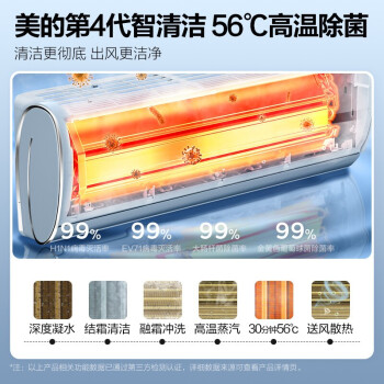 美的 风酷系列 N8XHC1 壁挂式空调,采用全直流变频架构,冷媒为R32,APF能效比高达5.27,符合新一级能效标准。内置高频速冷热技术,压缩机能够在数秒内高频启动,实现30s制冷,60s制热。搭载新一代大导风板,送风更远效率更高,角度更大,更有一键防直吹。智清洁高温除菌,通过56℃高温持续运行30分钟以上,实现99%的除菌率。